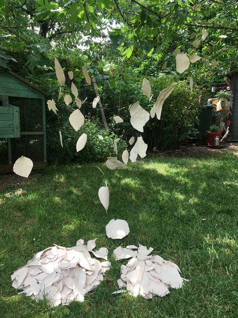 Je suis végétal, Installation in situ. Biscuit gravé et suspendu aux branches des arbres du jardin.